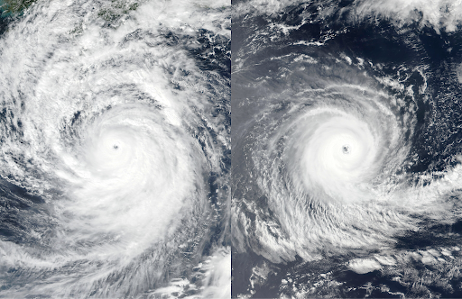 Satellite photographs of two hurricanes that occurred on different sides of the equator. Can you tell which hemisphere each storm happened in? [Answers: left - Typhoon Nanmadol in the northern hemisphere, right - Cyclone Darian in the southern hemisphere] (Source: NASA Worldview)